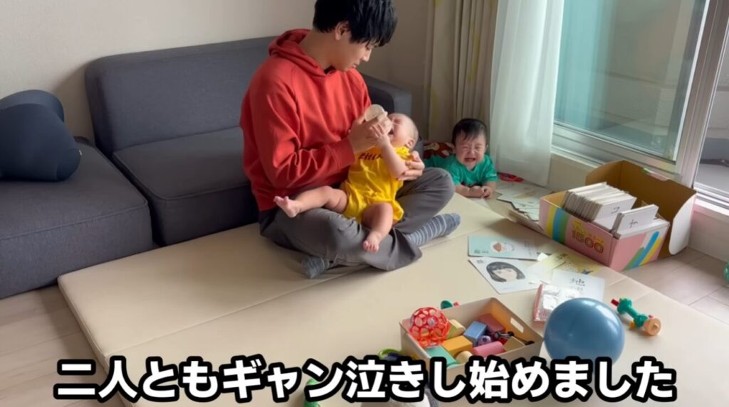 準備しておいたミルクを与えようとした矢先、二人とも同時にギャン泣きを始めました。