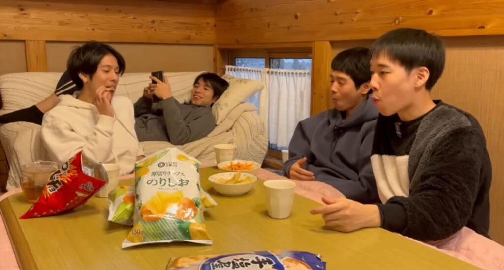 たかおが帰省している時、みんなでポテトチップスを囲んで雑談していました。