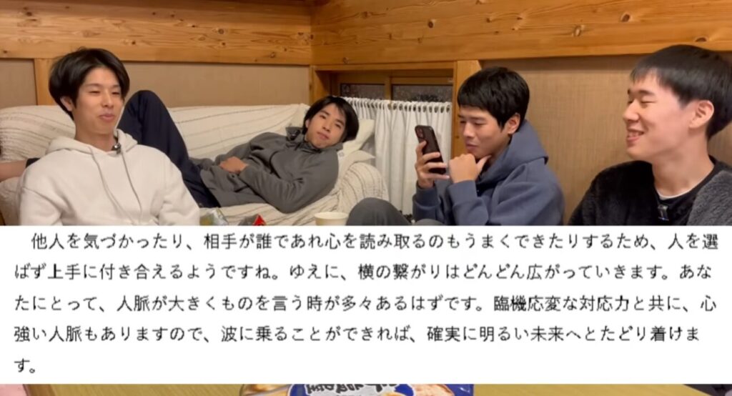 占いの結果をまとめると、僕以外は比較的当たっているという評価になり、名前にゆがつくとダメなんかもしれないという冗談も飛び出しました。