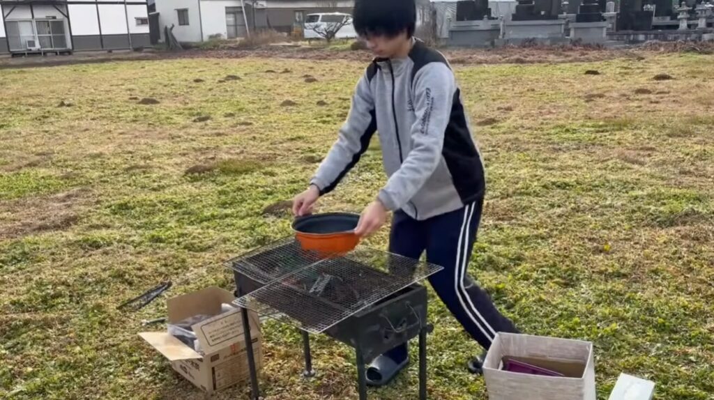 バーベキューセットを外に運び出し、炭を使って火起こしを始めます。