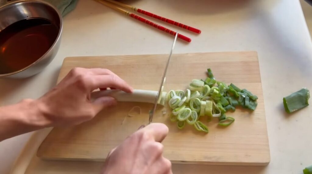 卵を溶いて準備を整え、ネギも刻んでいきます。