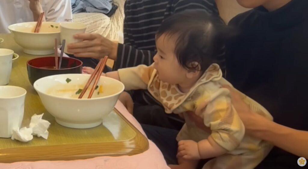 家族でラーメンを囲んで、赤ちゃんの成長を見守る時間は、本当に貴重ですね。